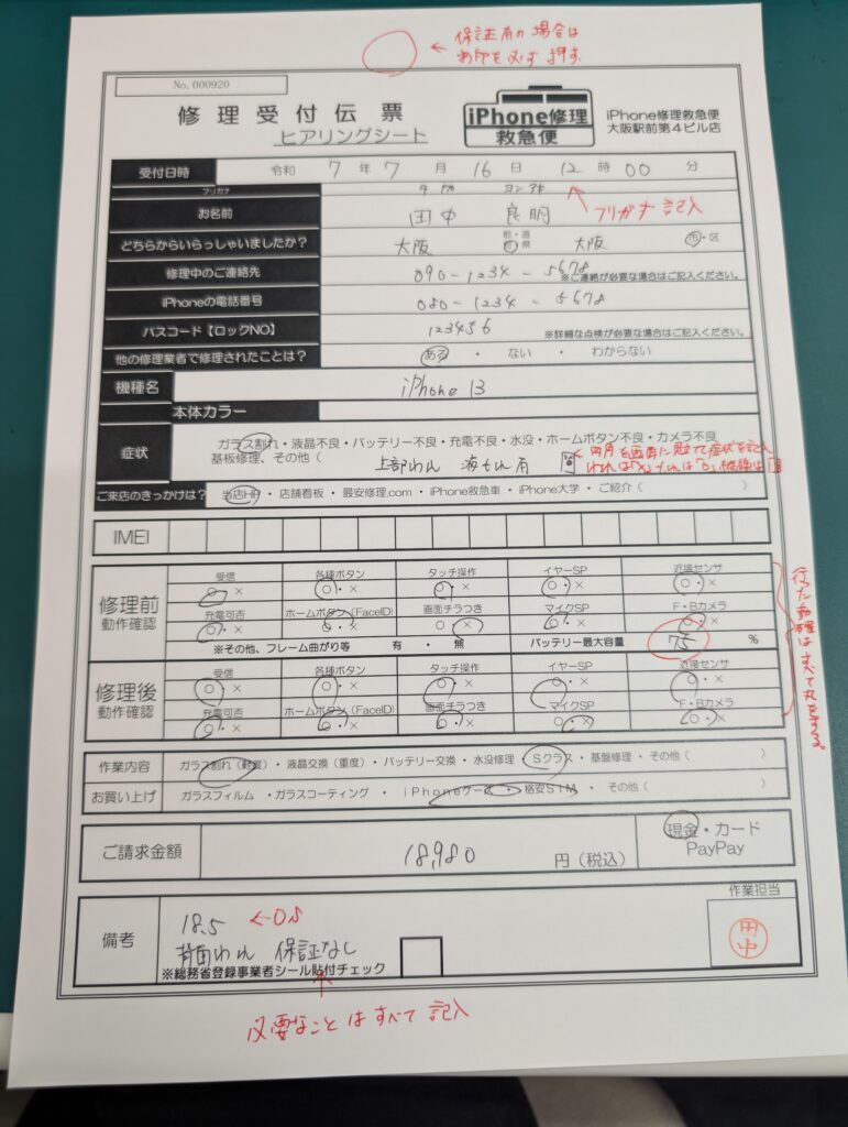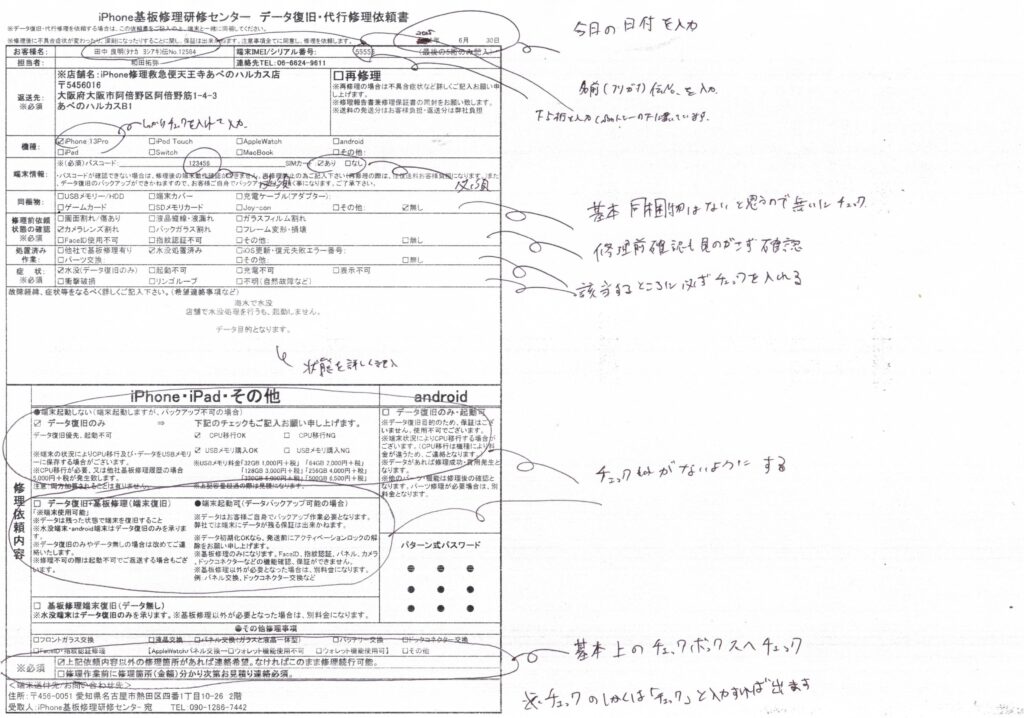 IMEIや動作確認のチェック、症状など以前、田中がお送りした画像の通り記入する